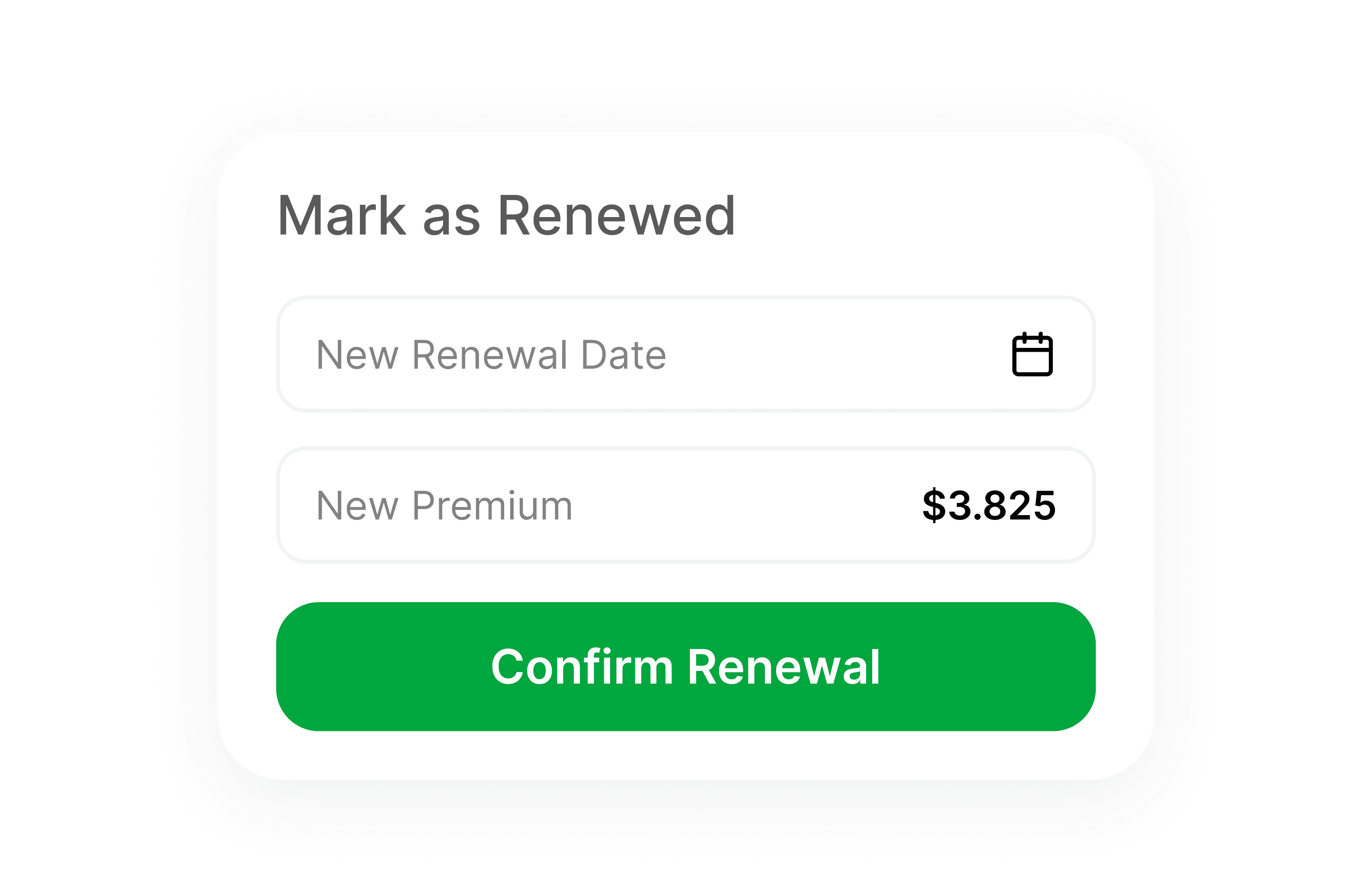 Move renewals from overdue to renewed, mark contacted, or send an email — all in seconds.