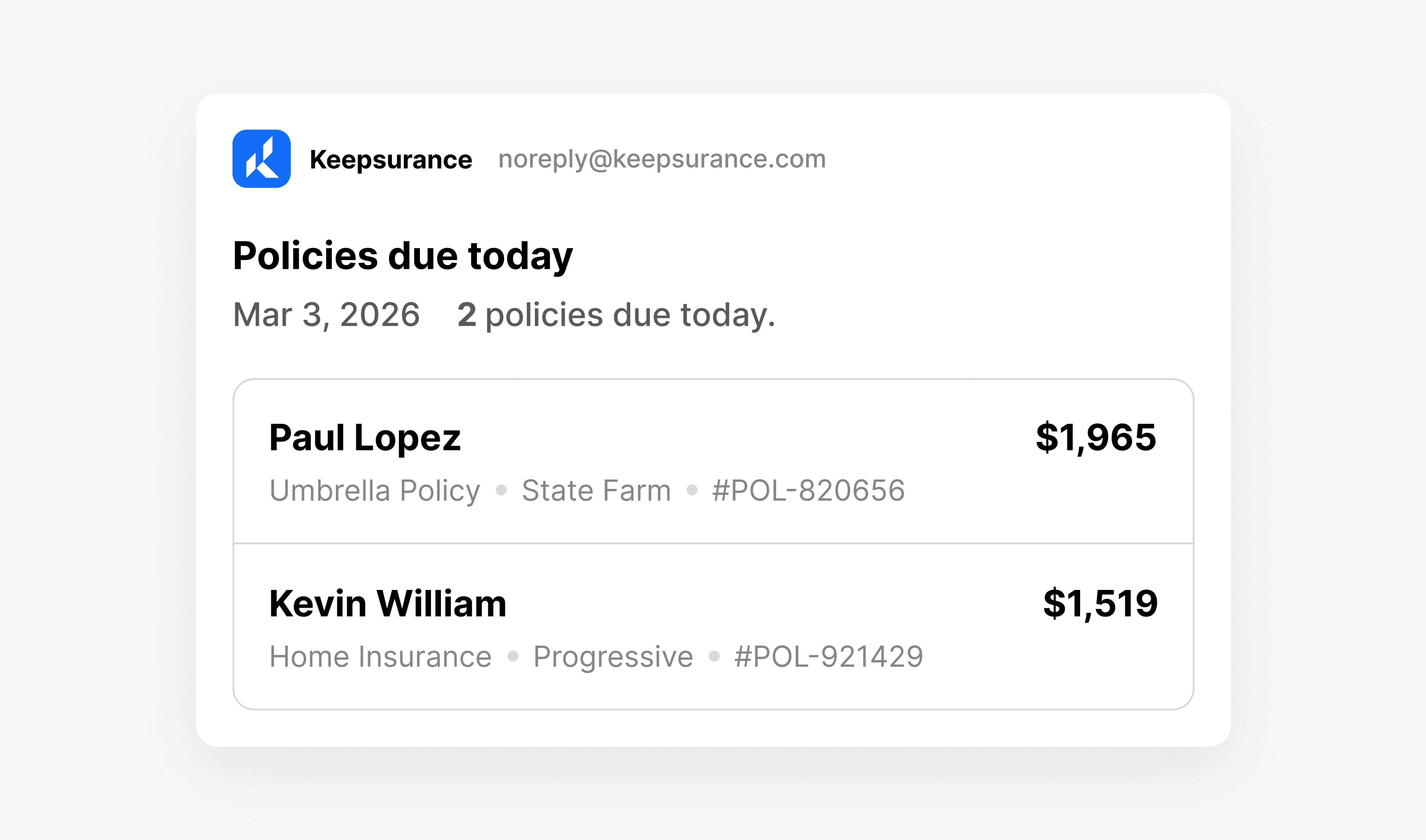 Every morning, Keepsurance sends a simple email summary of policies due today.
